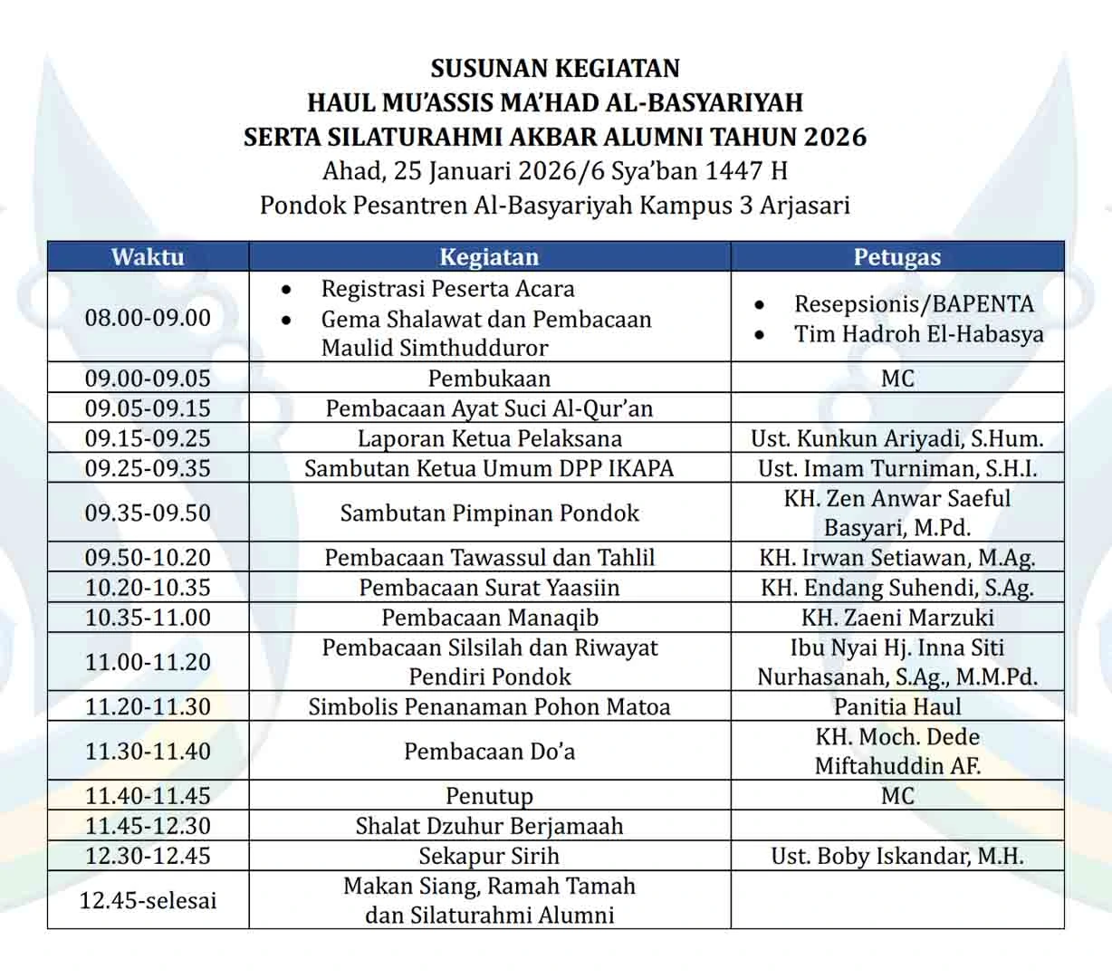Kami memanjatkan doa semoga Allah SWT senantiasa menganugerahkan kesehatan, kelapangan waktu, serta kemudahan urusan kepada seluruh alumni, sehingga dapat berkesempatan hadir tepat pada waktunya dalam rangkaian acara ini.